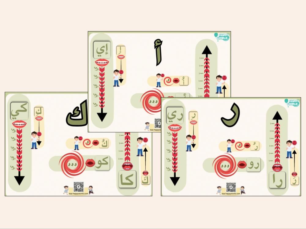 يحتوي على جميع الحروف العربية بتصميم جميل وواضح يساعد الطفل على تعلّم النطق الصحيح بالصوت القصير والطويل بطريقة ممتعة وسهلة 💕